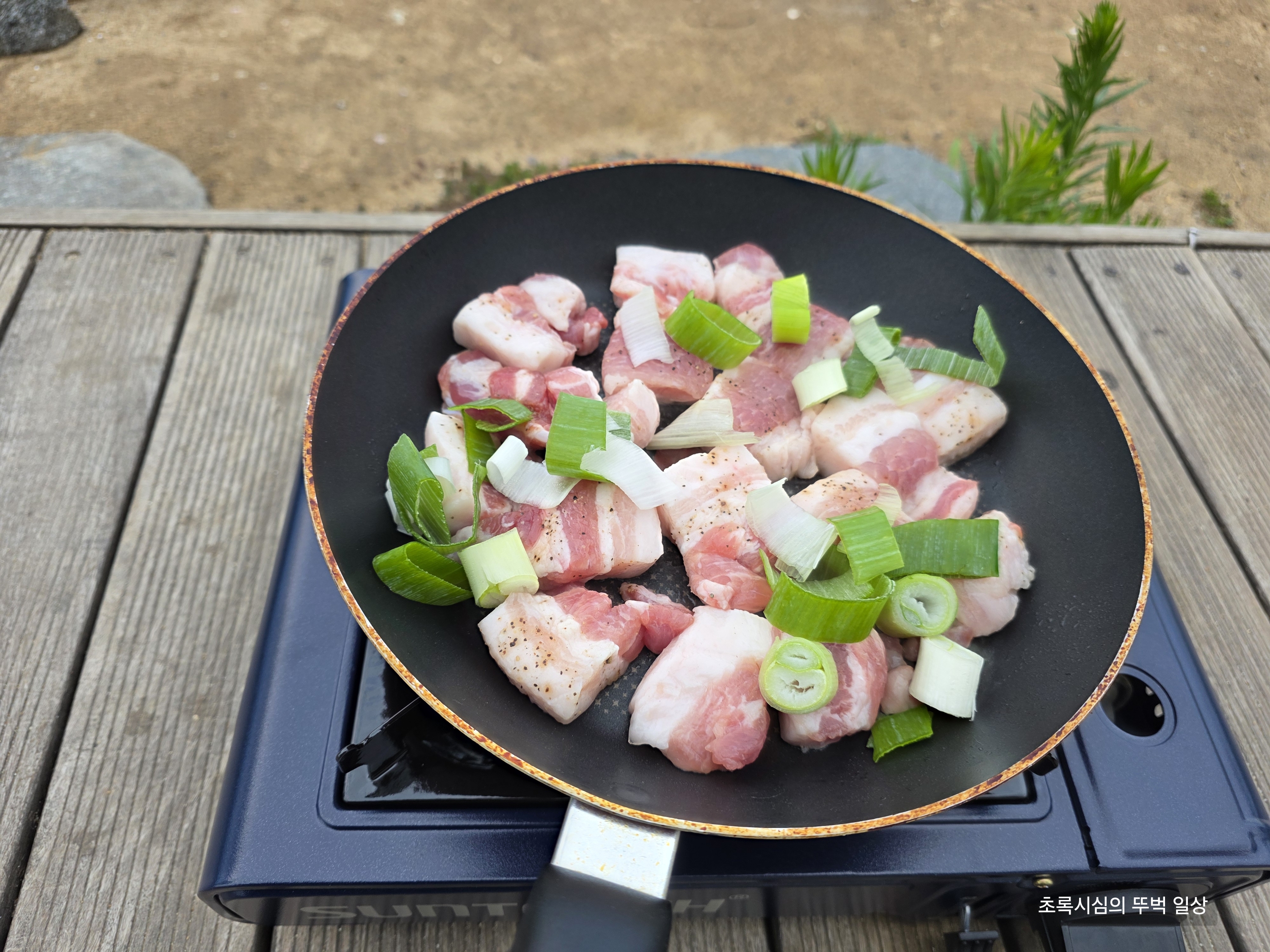 야심차게 전날 통삽겹살을 사서 자른 후 시즈닝을 해서 냉동시킨 후 아이스박스에 담아 왔는데요,