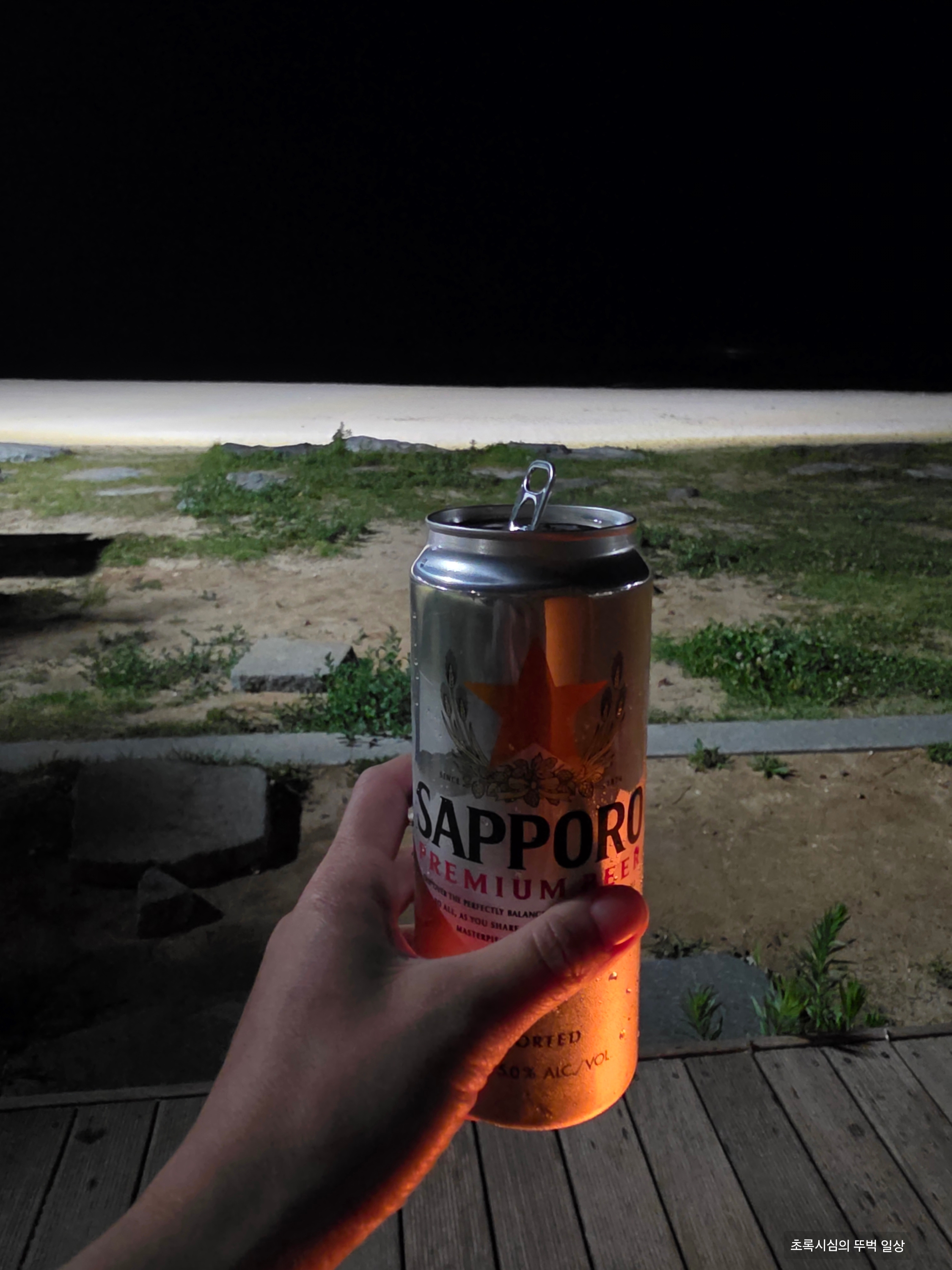 조금씩 튀어오는 비를 맞으면서 급히 맥주를 마무리 하고 샤워실에서 씻고 들어와 잡니다.