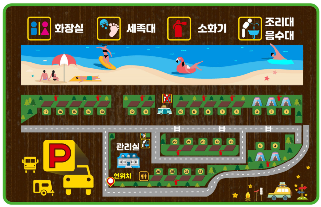 - 시설: 전기 연결 가능, 화잣실, 샤워실, 개수대(퐁퐁 및 수세미 없음), 관리사무소 앞에 전자레인지 있음