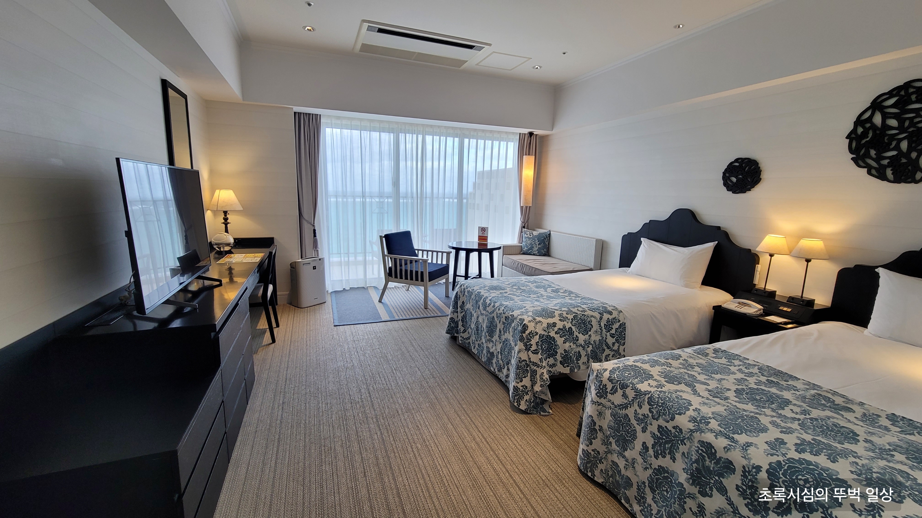 - 룸: 스탠다드오션뷰트위룸에 묵었어요. 방은 넓은 편이고, 세면대, 화장실, 욕실 나눠져 있는 구조에요. 베란다에서 탁 트인 바다 전망보며 쉴 수 있어요.