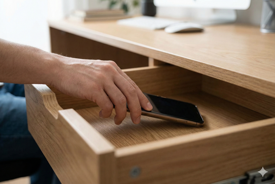 - 최소한의 타협: 책상 위 절대 금지. 손이 닿지 않고 눈에 보이지 않는 곳(예: 현관 신발장 위)에 둔다.
